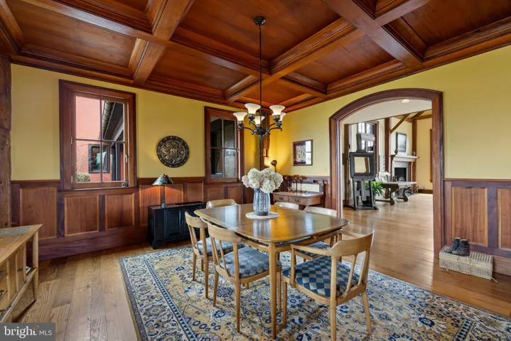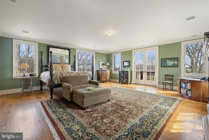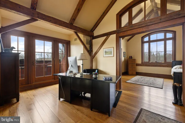 As one enters the home, the materials and attention to detail are evident. Throughout the main and upper level is handsome random width oak flooring, milled locally. The lowest level flooring is a combination of limestone and wool carpeting. Gaston and Wyatt in Charlottesville provided the fine millwork and cabinetry throughout the house, the soapstone kitchen countertops also came from Charlottesville. Most of the high-end plumbing fixtures are from Water Works and Barber Wilson. The windows are double-paned Kolbe & Kolbe French casements with large panes framed by beautiful molding. Ceilings are varied and include vaulted with rustic exposed beams, as well as a beautifully finished mahogany coffered ceiling in the dining room. The stunning home has large windows, and French doors throughout with balconies, porches and terraces on three levels.There are gorgeous views in all directions.