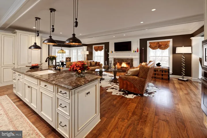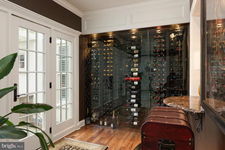 Returning to the foyer, there is a half bath and to the right is the light filled kitchen completely open to the family room with its wood burning fireplace. To each side of the family room, previous porches were seamlessly incorporated into the family room providing a lovely glass walled breakfast room looking out to beautiful gardens and to the other side a stunning tasting room with glass front wine cellar with Duo controls to hold up to 500 bottles. From the tasting room one has access to an outdoor dining terrace and gardens. The gardens are surrounded by intimate lighting with Walpole fencing.