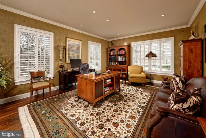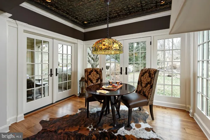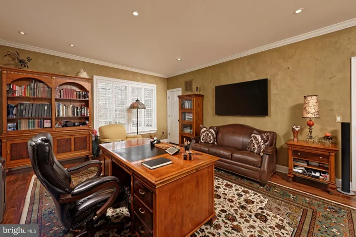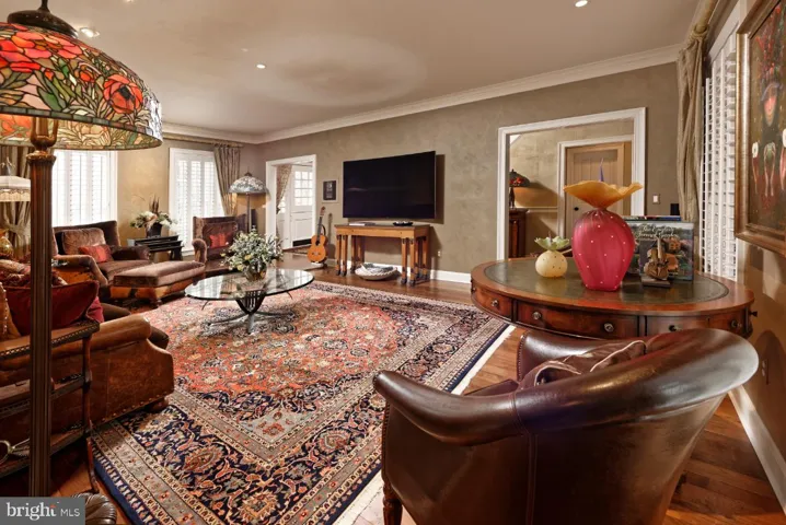 This one owner home has been meticulously maintained and renovated. The wide front door opens to the gracious center hall foyer with wide plank walnut flooring and professionally faux painted walls. To the left of the foyer is the formal dining room and to the right is a handsome living room with wall mounted tv and sound system. Beyond the living room is a full bath and first floor bedroom or study with French doors to a back terrace.