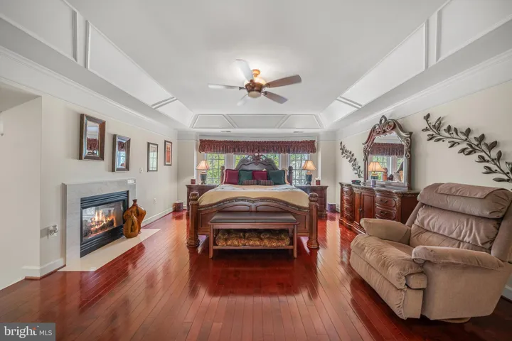 Upstairs, the oversized primary suite is a true retreat with a separate sitting area, tray ceiling, two large walk-in closets, and a spa-like bath featuring a soaking tub, dual vanities, and a separate shower. The upper level also includes a second ensuite bedroom, two more bedrooms connected by a Jack-and-Jill bath, and a unique architectural feature— an interior glass window overlooking the front entryway, allowing extra light and openness.