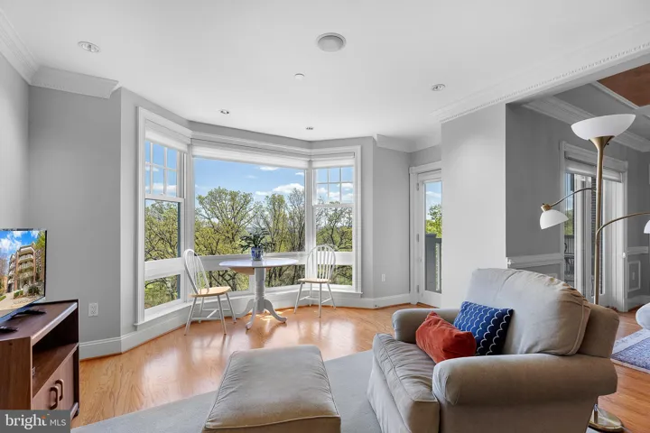The expansive living and dining area features hardwood floors, a cozy gas fireplace, and a bay window with views of the Netherlands Carillon and the Washington Monument. Step onto your private balcony to enjoy the peace and privacy of the wooded setting—an unexpected retreat in such a connected location.