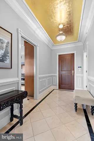 From the moment you enter, the home sets a tone of quiet sophistication. The foyer greets you with a hand-applied gold leaf ceiling detail—a subtle but striking design element that sets the stage for what’s to come.