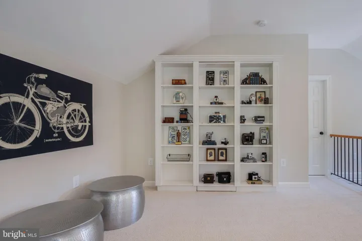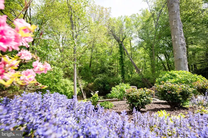 The upper level is home to six bedrooms, each with ample storage and closet space, including walk-in closets. Two bedrooms share a bathroom, while one guest bedroom has an en-suite bathroom. A two-bedroom addition shares a sunlit bathroom. The luxurious primary suite offers stunning wooded views, built-in bookshelves, steps to cozy sitting room, and a spa-like bathroom with dual vanities, a separate shower, and a soaking tub. Two large walk-in closets with custom shelving provide plenty of storage. The home offers an abundance of closet space throughout, and a huge walk-up attic provides potential for additional finished space.