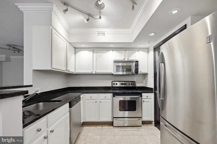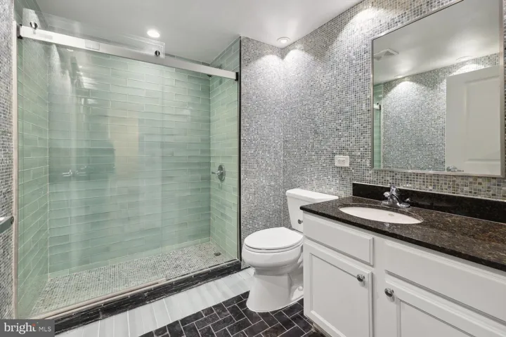 The living room and both bedrooms are enhanced by high-end crown molding, adding a touch of sophistication and elegance to each space. Recessed lighting in the living room, kitchen, and both bathrooms further elevates the ambiance, highlighting the condo’s sleek design. Both bathrooms are designed with luxury in mind, showcasing beautiful marble tiles and upgraded, eco-friendly, water-efficient toilets. The hall bath features a walk-in shower with a full glass enclosure, offering both style and practicality. For added convenience, your in-unit washer and dryer make laundry a breeze.