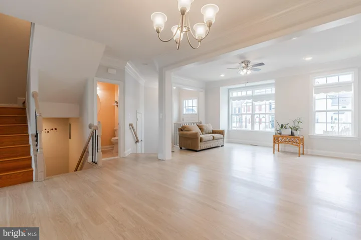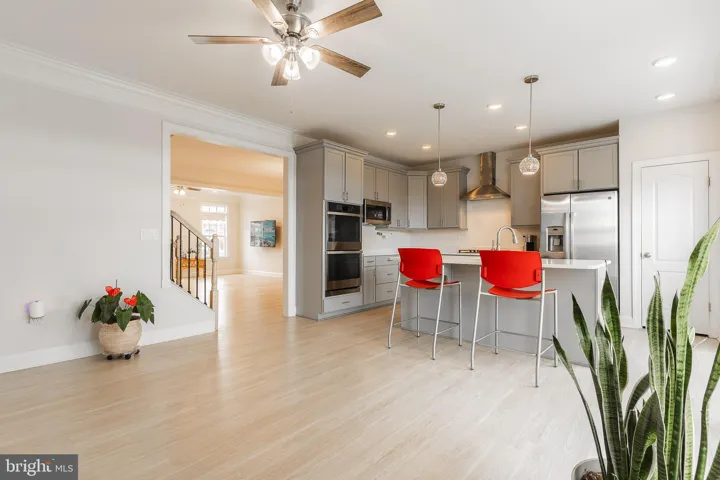 The open kitchen is a total showstopper, with sleek gray cabinets, a breakfast bar for quick meals, a sunny table space area, and sliding doors leading right out to your private deck, perfect for morning coffee or summer BBQs. The formal living room feels bright and airy with a big bay window, and there’s a separate dining room with crown molding and wainscoting that’s ready for your next dinner party.