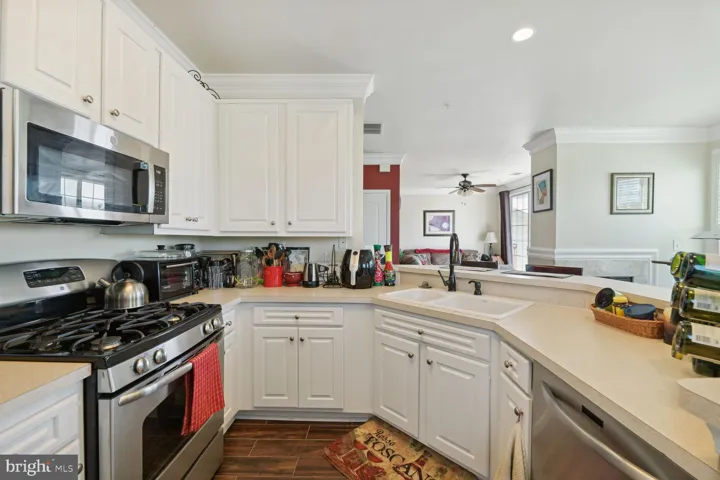 The kitchen is designed for both beauty and practicality, boasting crisp white cabinetry, stainless steel appliances, a gas range, ample counter space, and a passthrough that opens to the main living area, great for entertaining or staying connected while you cook.