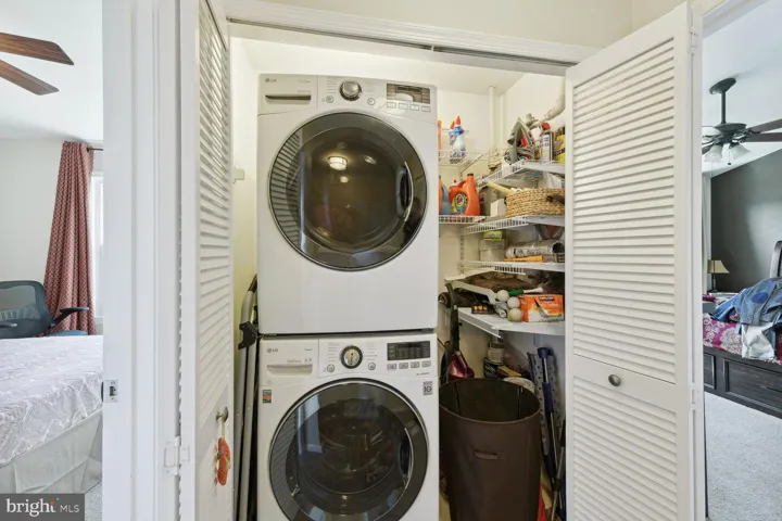 Upstairs, two generous primary suites each offer walk-in closets, en-suite bathrooms, and plush carpeting. A main-level powder room adds convenience for guests, and the dedicated laundry closet features a high-efficiency washer/dryer set with built-in shelving for extra storage.