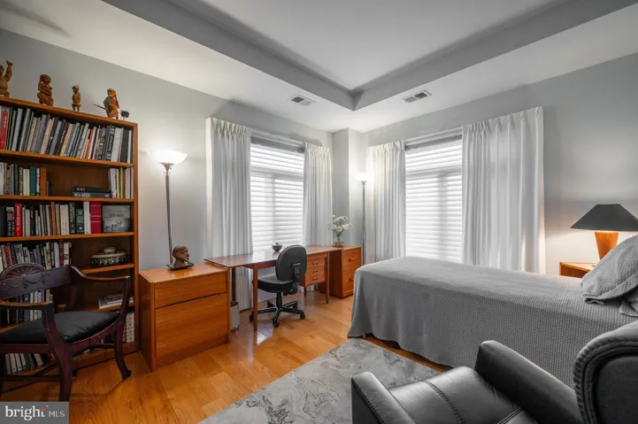 THIS LUXURY CONDO IS TWO UNITS COMBINED INTO ONE! : units 706 and unit 707 for a total combined square footage of 1629sf. Unique to Colecroft – this stunning condo features high ceilings, clean lines, large spaces and abundant square footage. Meticulously cared for and maintained, this is a truly move-in ready condo! Two balconies with views for days, natural light from 3 sides, large windows, refinished 3/4″ oak flooring, one-touch light switches, pull-down window treatments, all closets professionally outfitted, two (2) reserved garage parking spaces and 2 visitor spaces, 2 zone heating and cooling. Walkable Old Town Alex neighborhood and across the street from Braddock Rd Metro. Outside picnic and grilling, work out room, party room. A one of a kind Old Town experience!