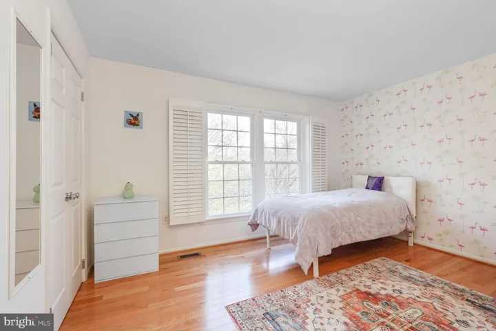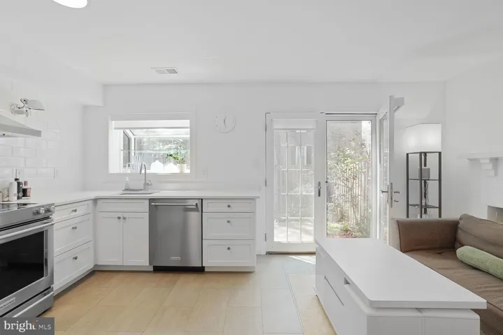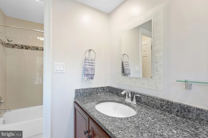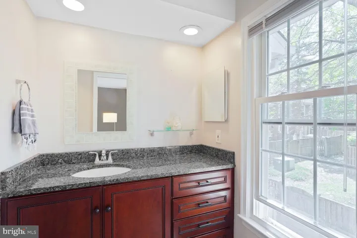 Rarely available, Bristol model, 2BR/3.5BA end-unit townhome in Windgate II with three finished levels. The main level features hardwood floors, recessed lighting, and a fully renovated kitchen with white cabinetry, quartz countertops, subway tile backsplash, stainless steel appliances, porcelain tile floors, and a wood-burning fireplace. French doors open to a private, fenced-in patio with southern exposure. There’s also a main-level powder room with an updated vanity and fixtures.