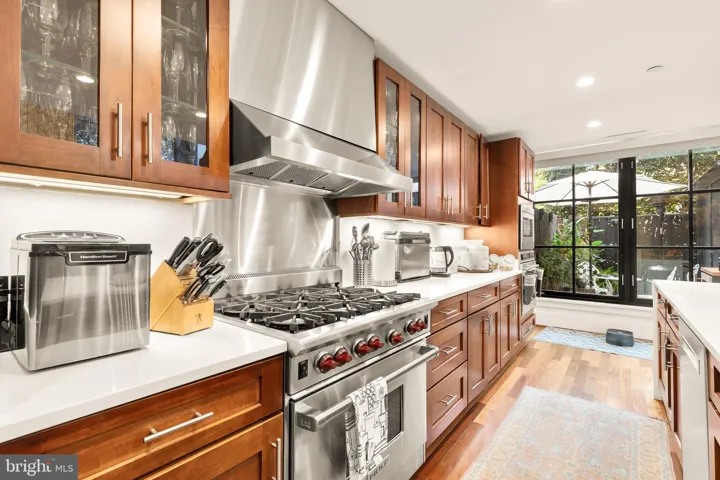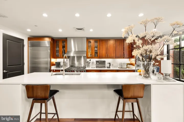 The standout feature is the expansive, fully private outdoor terrace—an entertainer’s dream with a built-in bar, refrigerator, serene water features, and direct gated access to a quiet, tree-lined street. The outdoor space also includes smart lighting, heat lamps, air conditioning, and a Ring doorbell system for added convenience and security.