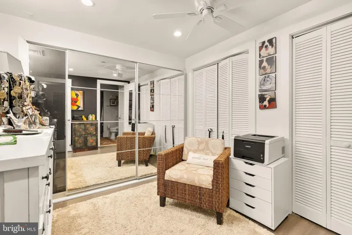 The primary suite is generously sized with extensive closet space and a spa-like bath featuring two separate showers (one with a tub) and a smart electric bidet toilet. A den/office space sits just off the landing, while the second floor hosts an expansive secondary bedroom with an ensuite bath and a cozy sitting area—ideal for guests or a private retreat.