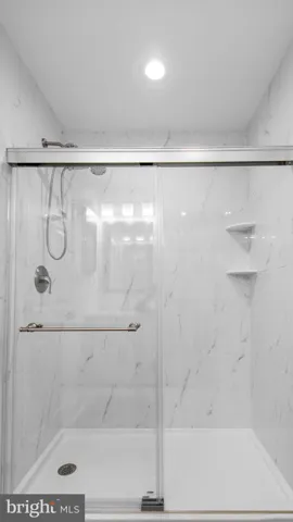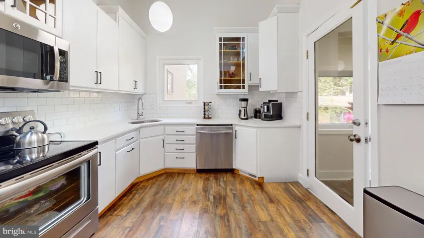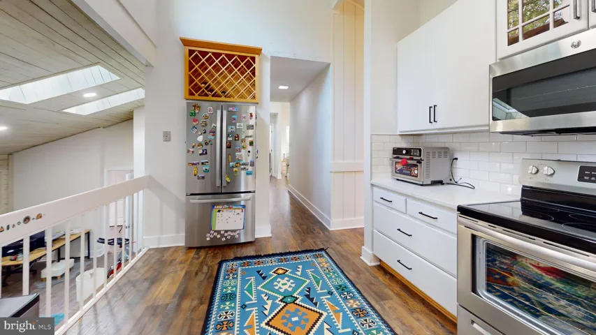 The fully updated eat-in kitchen is the heart of the home, equipped with Carrara quartz counters, a walk-in pantry, stainless steel appliances, sleek cabinetry with a new backsplash, and an additional staircase that leads directly to the spacious family room or office space—a flexible area perfect for today’s evolving needs.