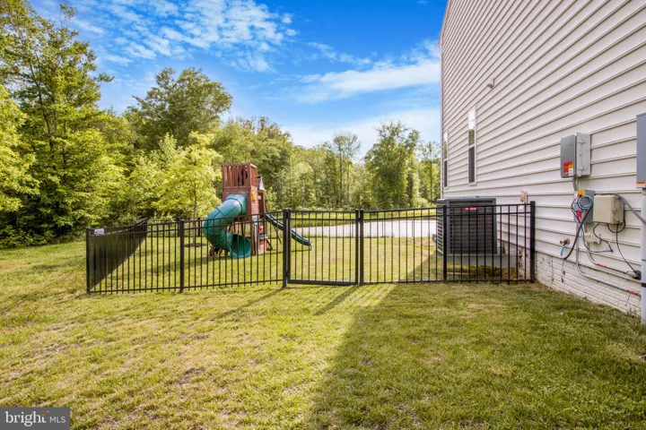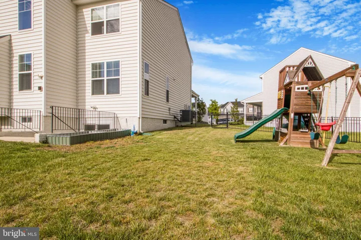 Fully fenced backyard with a whole-home smart irrigation system and playground set for kids.