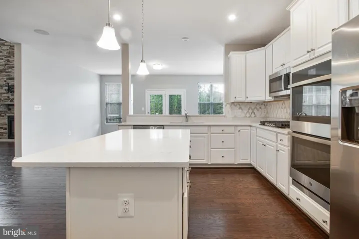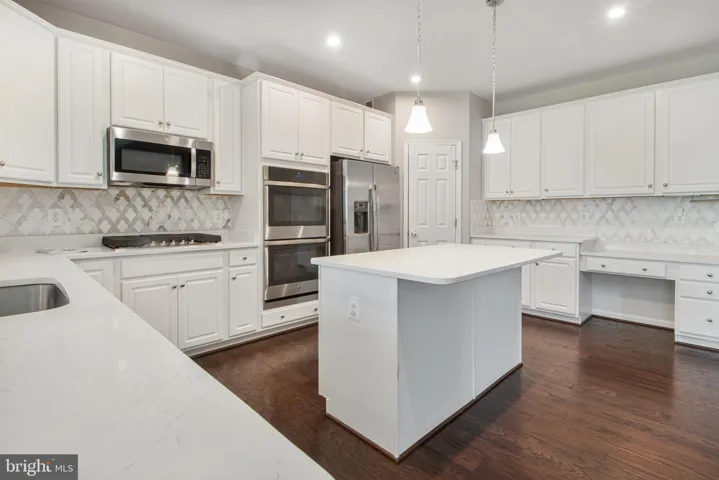 Modern gourmet kitchen with quartz countertops, stainless steel appliances, and center island.