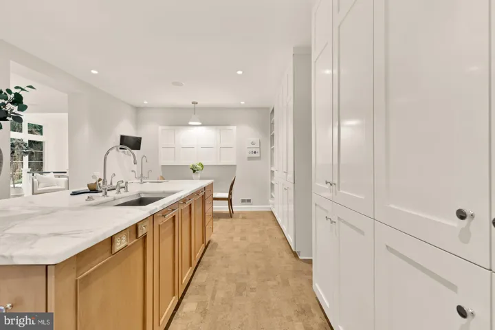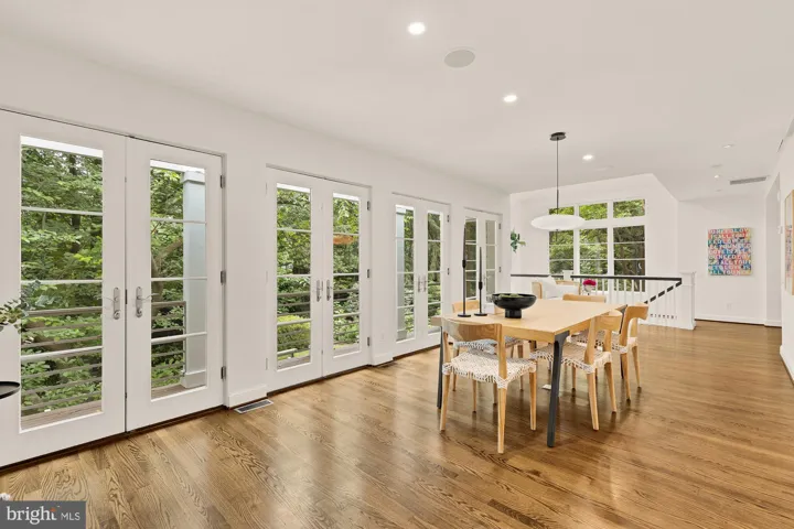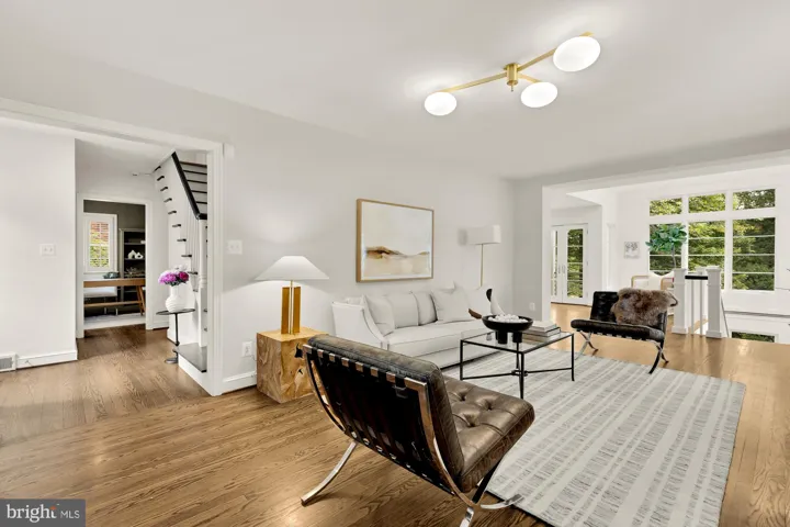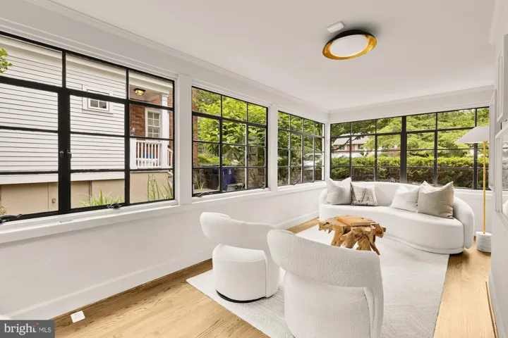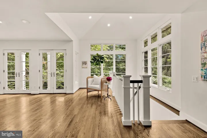 Step into a world of elegance through the central foyer, where classic craftsmanship meets thoughtful, contemporary updates. To the left, a versatile den/office (or main level bedroom), powder room, and chef’s kitchen await, boasting a marble-topped island, table-space area, custom cork flooring, side-exit, Dacor 6-burner cooktop, double ovens, and a paneled Sub-Zero refrigerator. To the right, the expansive living room with wood-burning fireplace flows into a sun-drenched sunroom, ideal for a home office, gym, den, or studio. The show-stopping rear addition elevates entertaining and every-day living with an oversized, long dining room + sitting area, floor-to-ceiling windows, cathedral ceilings, French doors, and walk-out balcony that invite the outdoors in, seamlessly connecting to the lush, flat backyard.