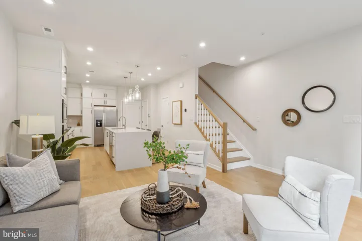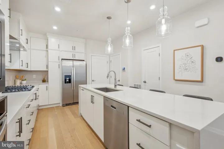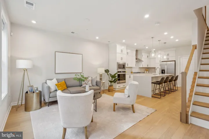 The open-concept main level is bright and sophisticated—ideal for both relaxed living and elegant entertaining. The designer kitchen is a true showpiece, featuring floor-to-ceiling cabinetry, striking waterfall quartz island with seating for four, custom pendant lighting, stainless steel appliances, and sleek quartz countertops.