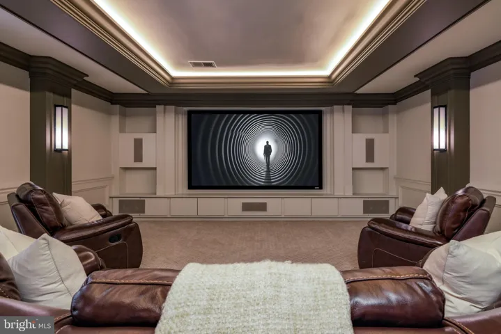 The lower level, designed for entertaining, includes a recreation room with a masonry fireplace, a central wet bar flanked by twin wine cellars, a game room, a professional home cinema, and a wellness center with a steam shower and sauna. A generous bedroom suite completes the walkout lower level.