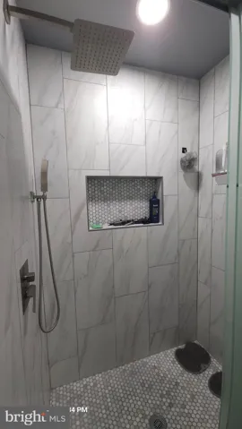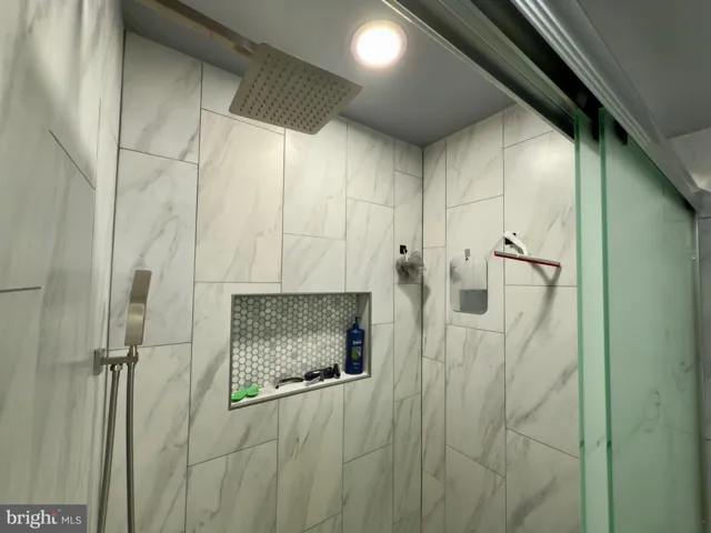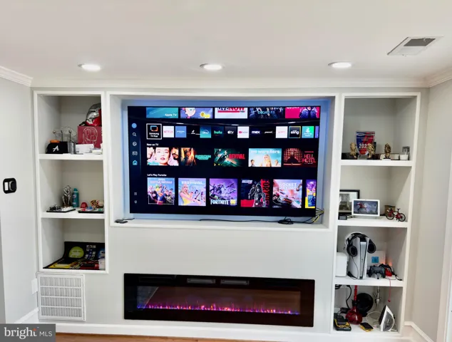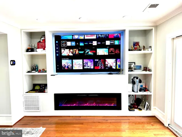 The main level features a brand-new full bathroom with a standing shower, a custom laundry closet with front-loading washer & dryer, and a sleek media wall with an electric fireplace, shelving, and space for an 85” TV.