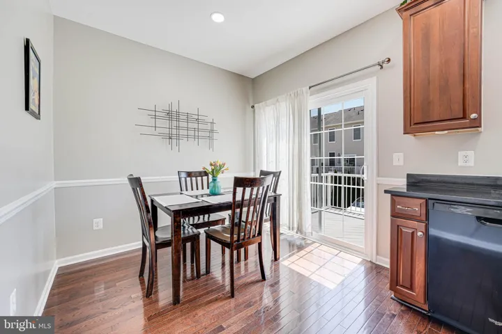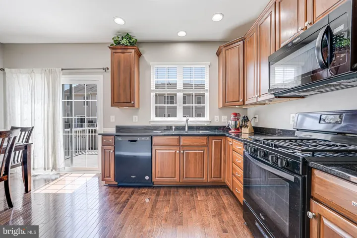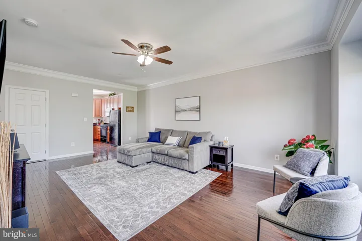 Inside, you’ll find sun-filled living spaces with gleaming hardwood floors, elegant crown molding, and a neutral palette ready for your personal touch. The spacious main living area flows seamlessly into the dining space and open-concept kitchen—complete with rich cabinetry, granite countertops, and modern black appliances. A sliding glass door leads to a large deck, ideal for relaxing or entertaining outdoors.