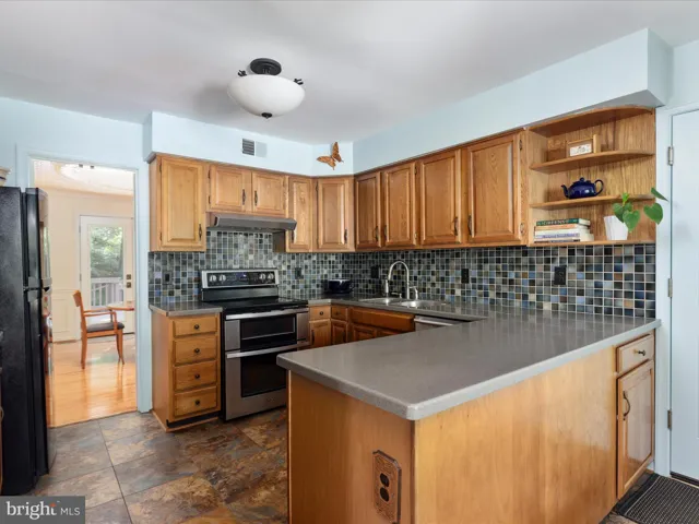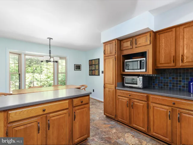 Step inside the light-filled foyer and be welcomed by refined living spaces thoughtfully designed for both comfort and entertaining. The main level includes a bright sitting room, a formal dining room with double French doors opening to the expansive deck and stamped concrete patio, and a renovated kitchen with the perfect morning view, tile backsplash, and generous eat-in space—all flooded with natural light.