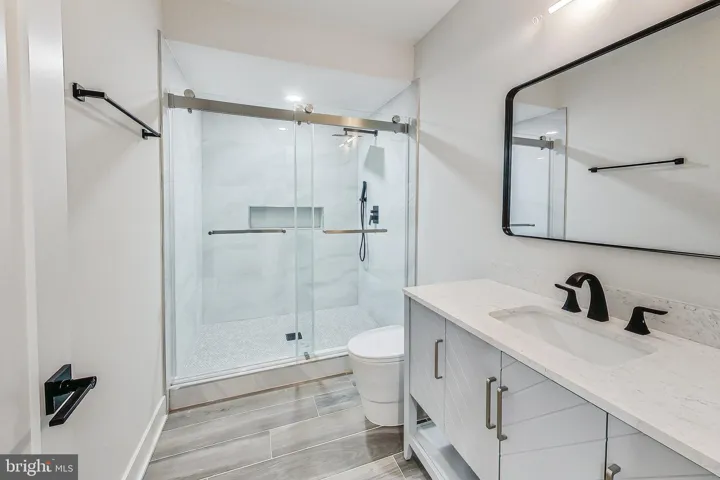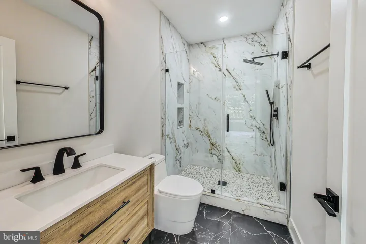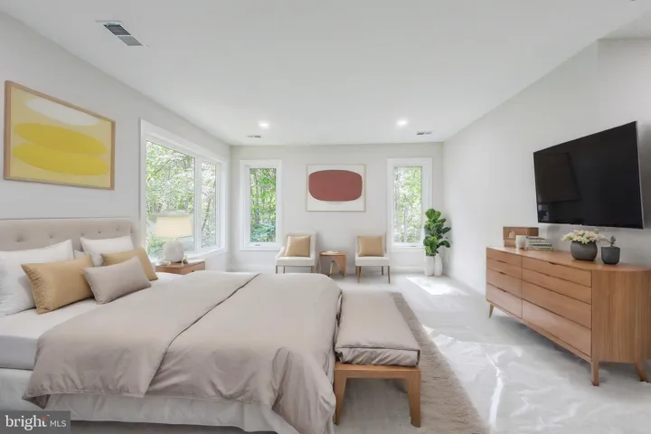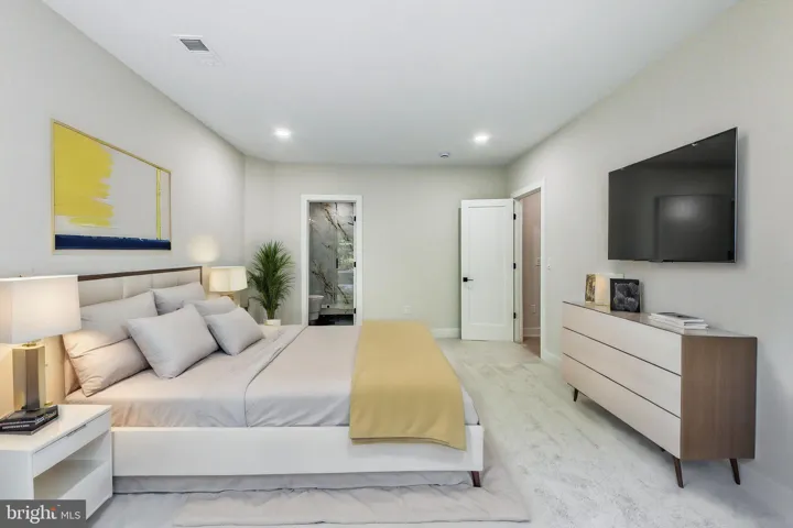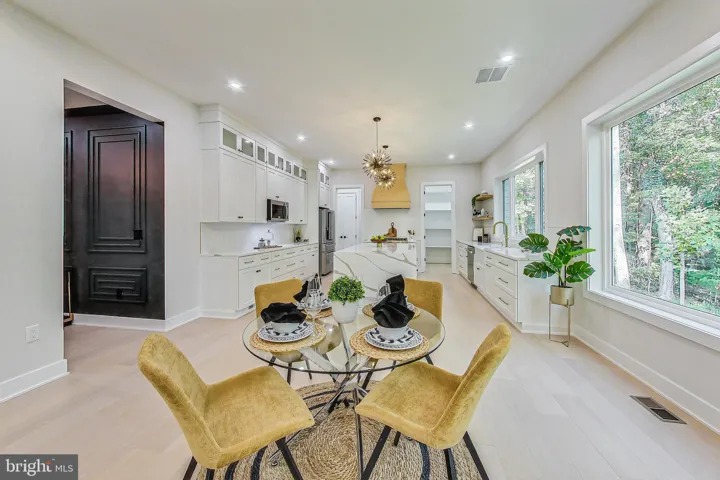 The expansive main level features a guest bedroom with a private full bathroom, along with a separate powder room for guests. At the heart of the home is a stunning two-story great room, anchored by massive picture windows and a sleek modern fireplace that makes a true architectural statement. The adjacent gourmet kitchen is a showstopper, designed with both style and function in mind, featuring top-tier ZLINE appliances—including a 36” gas range and oven, 48” professional-grade range hood, and stainless dishwasher and microwave—or comparable high-end models to ensure the highest quality. A large waterfall island adorned with Calacatta Quartz countertops, a farmhouse-style sink, and 42” maple Vita white shaker cabinets with transom uppers complete the kitchen’s magazine-worthy look.