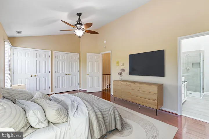 Upstairs, you’ll find three generously sized bedrooms, including a luxurious primary suite featuring vaulted ceilings, dual closets, and a spa-like en-suite bath with a soaking tub, dual vanities, and a separate shower. Hardwood floors and windows throughout provide comfort and energy efficiency. Two additional bedrooms share a well-appointed full bath, and the upper hallway is bathed in natural light.