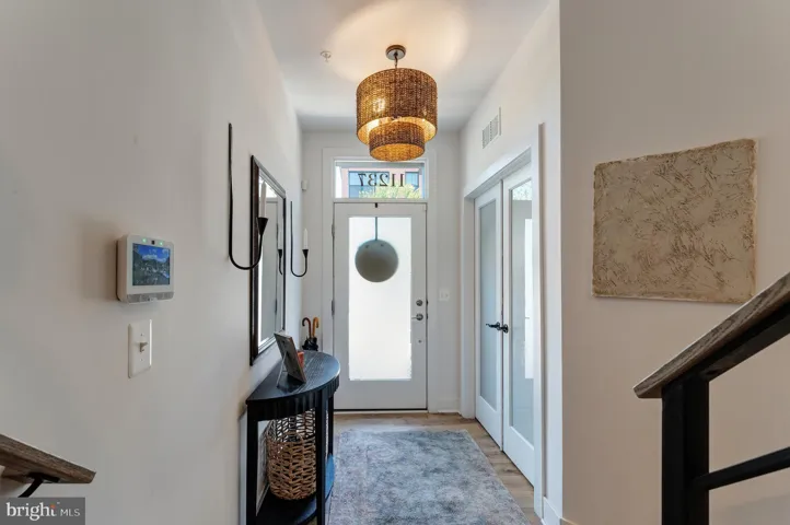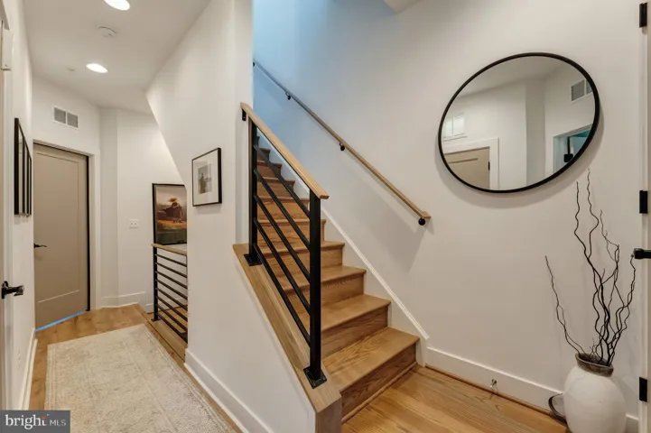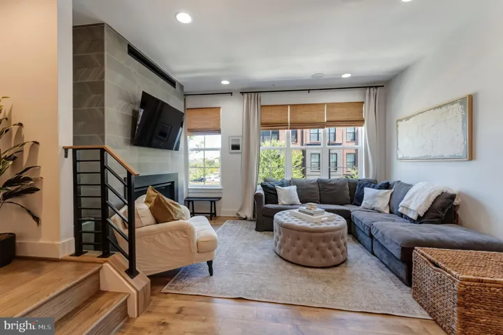 Step inside to find blonde wood flooring flowing throughout an open-concept layout, anchored by a spacious living room, featuring a striking fireplace with designer surround and sleek iron railings. The gourmet kitchen boasts crisp white quartz countertops and opens to a dining area perfect for entertaining. Triple sliding glass doors extend your living space outdoors on the third floor to a private patio and rooftop deck with natural gas line—ideal for morning coffee, evening grilling or sunset views.