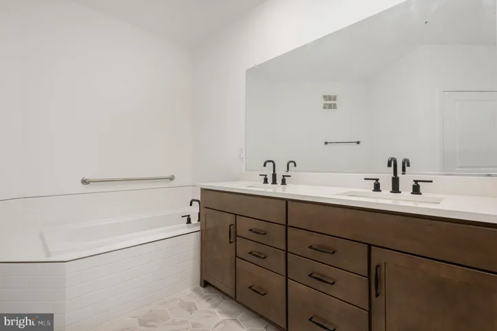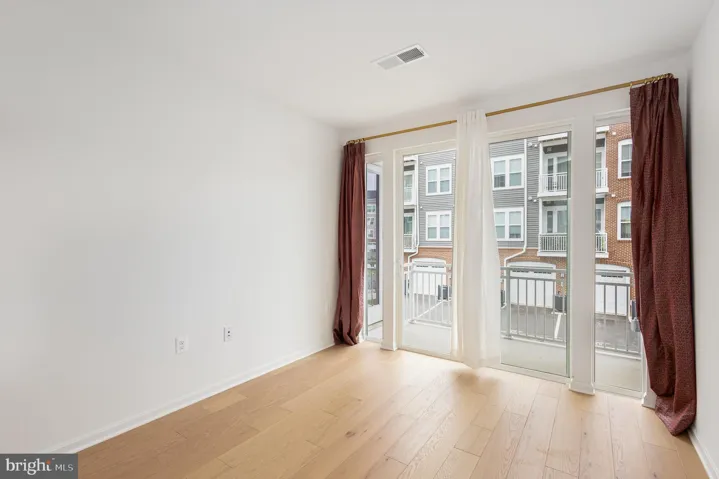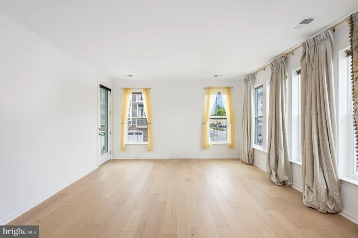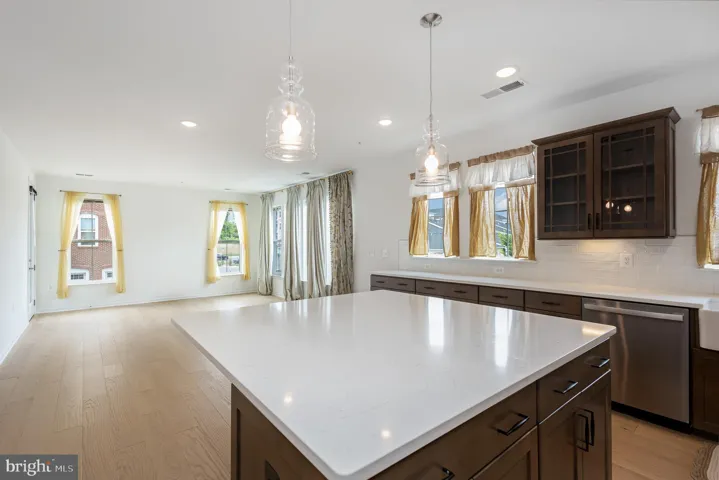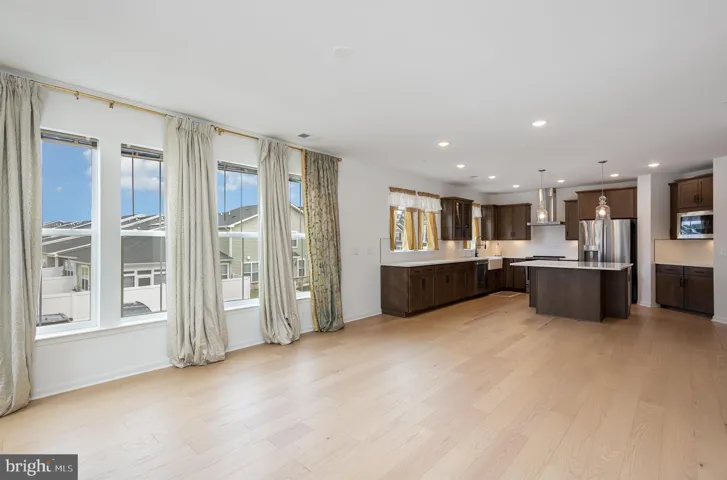 The chef-inspired kitchen features white quartz countertops, stainless steel appliances, a farmhouse sink, and a gourmet-style range hood, all on an efficient all-electric setup. Wide-plank hardwood floors and designer finishes flow throughout the home.
