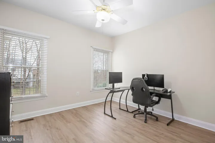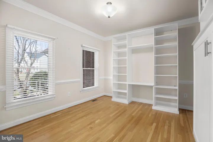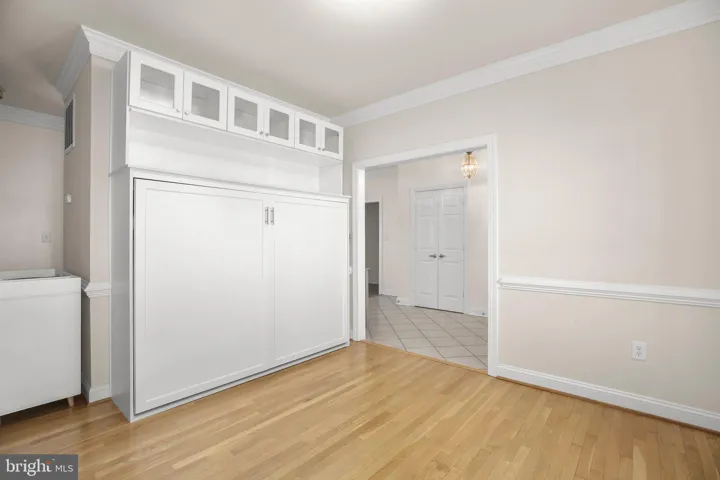 A versatile space to the left as you enter the home featuring beautiful hardwood flooring, built-in shelving, and a Murphy bed provides flexibility for remote work, a playroom, or hosting guests.