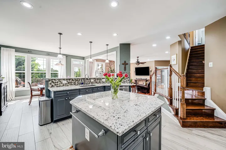 The main level offers versatility and elegance with two flex spaces—perfect for offices, studies, or libraries—and a warm family room featuring a striking stacked stone gas fireplace. The spacious formal dining room sets the stage for elegant gatherings, while the open-concept kitchen shines with its 2022 renovation, featuring all-new stainless steel appliances, double ovens, a 5-burner gas cooktop, granite countertops, a stylish backsplash, and a large walk-in pantry. The kitchen also includes a central island with stool seating and a generous casual dining area, making it ideal for both everyday living and entertaining. A convenient mudroom/laundry space adds function and flow.