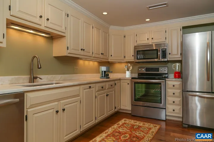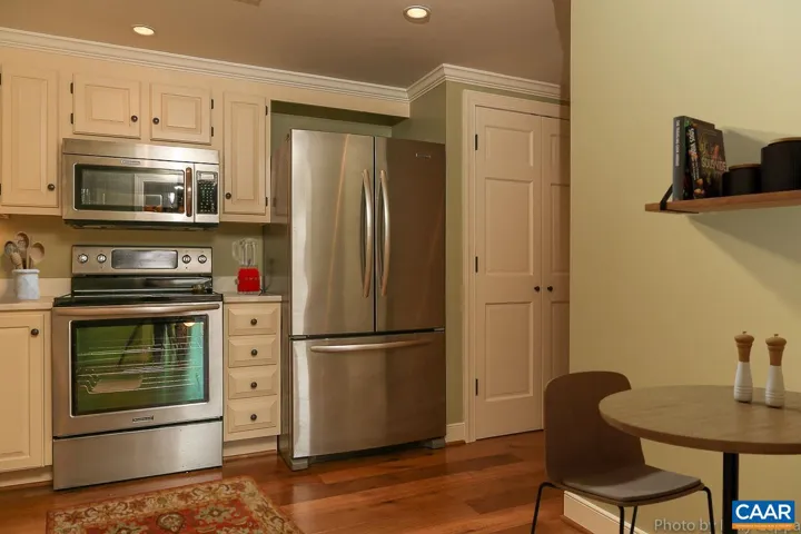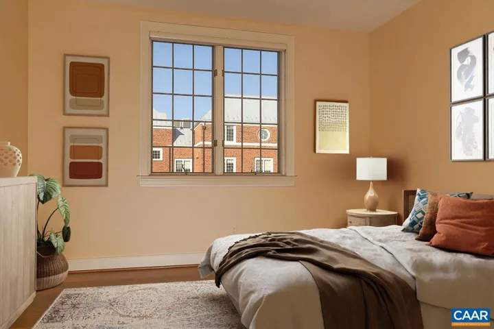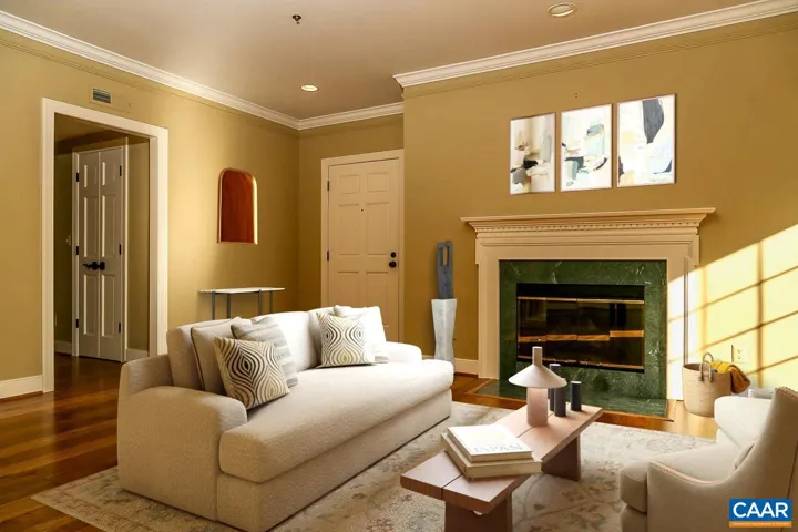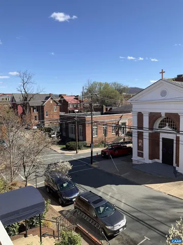 Enjoy everything Downtown Charlottesville has to offer from this prime location on East Jefferson Street only 2 blocks from the Downtown Mall with restaurants, theaters, art openings, and open air concerts all within walking distance. From the balcony you have a panoramic view of historic downtown buildings, churches, and homes and Market Street Park. Renovated interior has hardwood floors, updated kitchen and baths, stainless appliances and quartz counters. Full size kitchen has plenty of counter and cabinet space, a nice pantry, and room for a breakfast table. Open floor plan makes the living area feel spacious. South facing windows and balcony let in lots of sunshine into this upper floor unit. Full size washer and dryer in the hall laundry room convey. Enjoy the safety of a secured building and a covered parking space reserved for you in the ground floor garage. Take the stairs for exercise or use the elevator. Each unit has a generously sized, locked storage area in the basement for sports equipment or suitcases or seasonal items, etc. Condo fee covers water/sewer, gas service for the FP along with all maintenance of the building, exterior grounds, & interior common spaces. Both Ting & Xfinity high speed internet available.,Quartz Counter,White Cabinets,Fireplace in Living Room