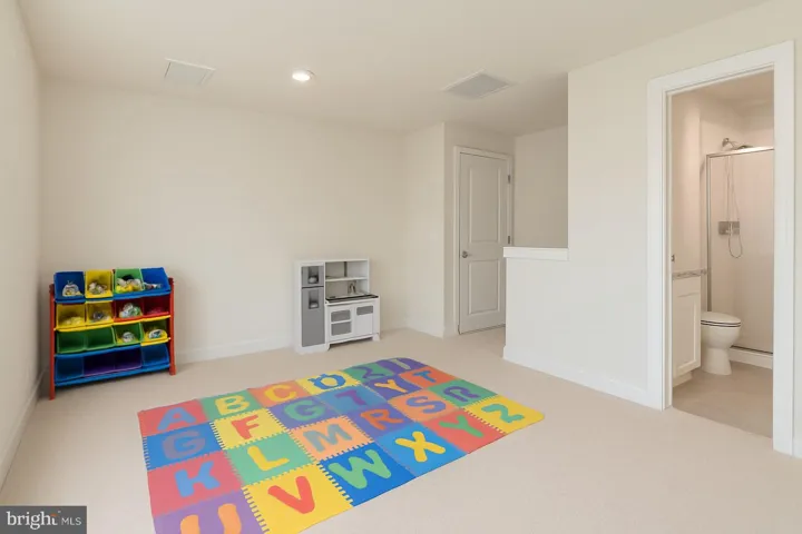 The main level impresses with a chef’s kitchen boasting quartz countertops, stainless steel appliances, a sleek range hood, subway tile backsplash, and an oversized island. The open-concept layout includes a spacious dining area and a stylish family room with built-in shelving, perfect for entertaining. Sliding doors lead to a maintenance-free Trex deck overlooking the community.