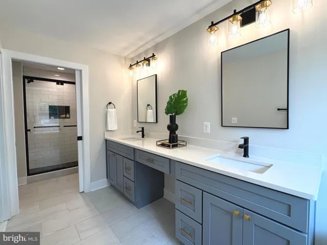 Bathrooms feature Tribeca Grey shaker cabinets, quartz countertops, porcelain tile, and tempered glass shower doors. Waterproof laminate flooring complements the oak staircase and landing beautifully.
