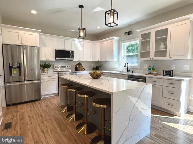 The kitchen is a chef’s dream, showcasing Snow White shaker cabinets, Calacatta Quartz Cascada countertops, stainless steel appliances, and a spacious walk-in pantry.