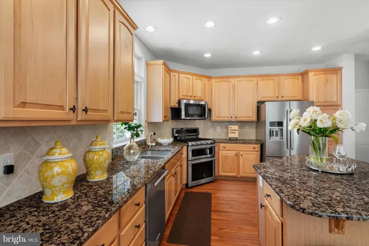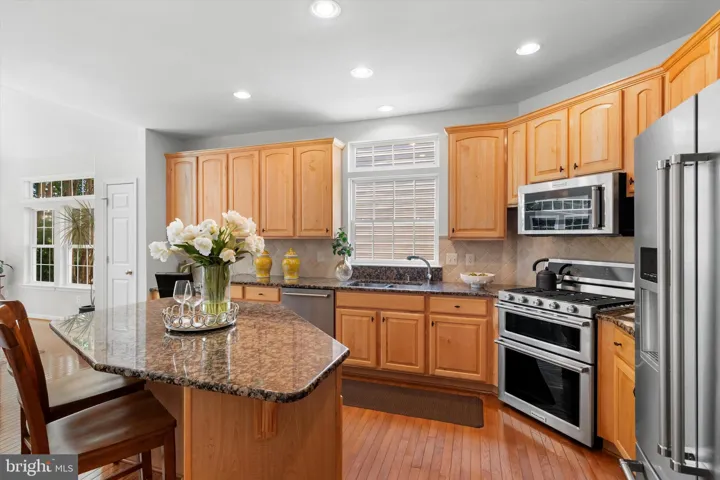 The Chef-inspired kitchen combines modern style with classic appeal, featuring granite countertops, stainless steel appliances, and a large center island—perfect for culinary creativity and casual gatherings alike. An adjacent sunroom, filled with natural light, creates a welcoming spot for relaxation or morning coffee.