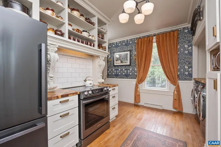 This one-of-a-kind 1917 Queen Anne Victorian has been meticulously restored, while maintaining old-world charm. This spacious 4 bedroom, 1.5-bathroom home sits on 1.59-acres comprised of two separate lots. The adjoining lot offers exciting potential for future development, public utilities available. Enjoy Blue Ridge Mountain views from the newly built wraparound porch. Inside, discover historic elegance and thoughtful updates, including a custom-designed kitchen with handcrafted cabinets and open shelving, inspired by the home’s original old-world cooking aesthetic. Upstairs, a hidden staircase leads to the private primary suite, with the flex room off the bedroom offers versatile use as an office, nursery or easy plumbing access for a second full bath. Original hardwood floors and custom millwork enhances every room. Recent upgrades include a fully renovated kitchen, bathrooms, HVAC, interior and exterior paint and much more. Outside, explore walking trails, fruiting trees, an historic outbuilding, and a custom brick firepit. The adjoining wooded lot adds privacy and wildlife. The property also features a carport and owned solar panels. Located minutes to Downtown, homes like this rarely come available -schedule a showing today!,Wood Counter