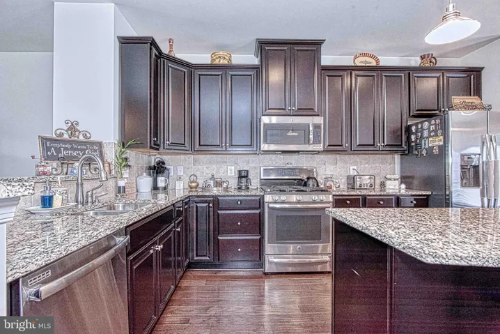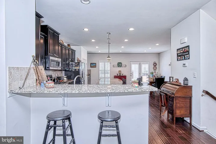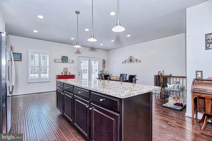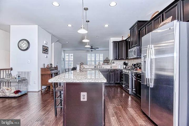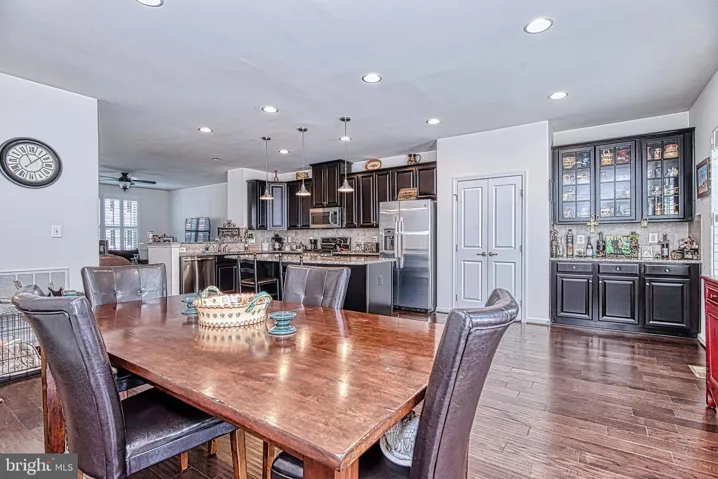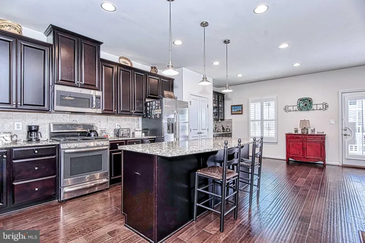 Step into a welcoming tile-floored foyer that leads to a beautifully crafted wooden staircase adorned with wrought iron spindles. The main level boasts gorgeous hardwood floors throughout, complementing the gourmet kitchen complete with an expansive island, granite countertops, and 42-inch upgraded cabinetry. Stainless steel appliances and an extended hutch in the dinette area provide both functionality and style.