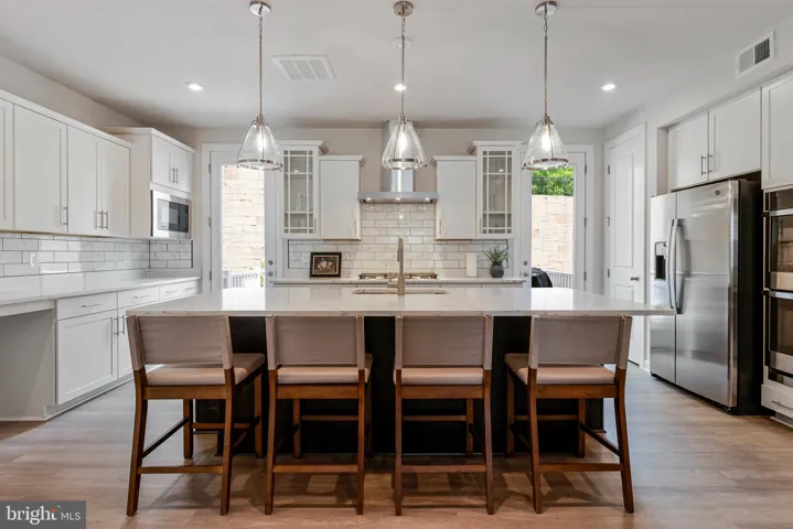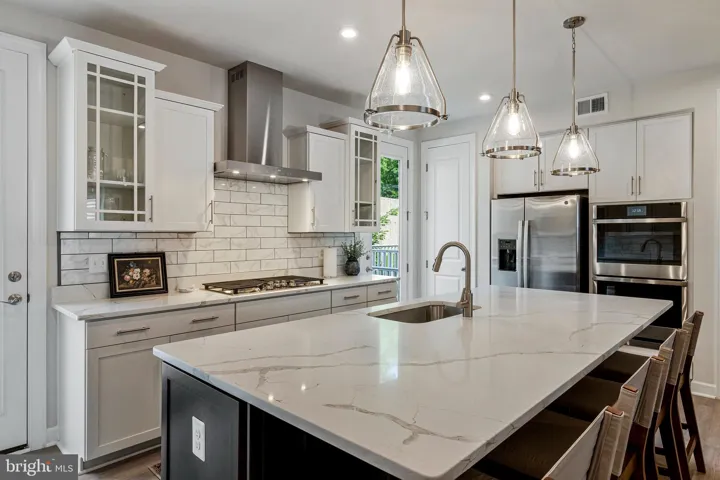 The gourmet kitchen is equipped with quartz countertops, a full tile backsplash, a large island, and high-end cabinetry and access to the large deck—ideal for everyday living and entertaining.