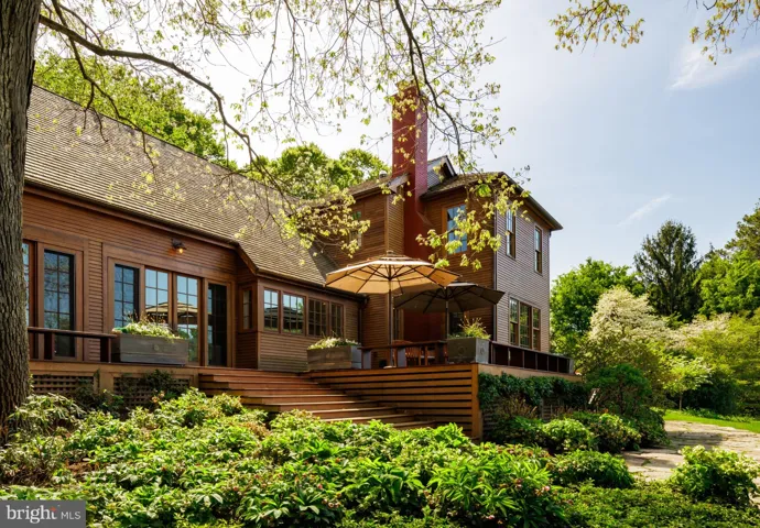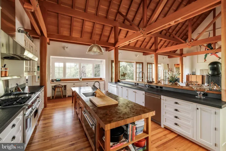Opposite, the informal wing inspires awe with its soaring 30-foot vaulted ceiling, fully exposing original wooden beams and columns. At its heart lies the chef’s kitchen, complete with a custom wooden prep island and a comprehensive suite of Sub-Zero and Wolf appliances. A large, tiered island bridges the transition into the family room, where a roaring wood-burning fireplace with substantial stone surround commands attention. French doors open to the rear deck, while a wall of windows frames the front lawn.
