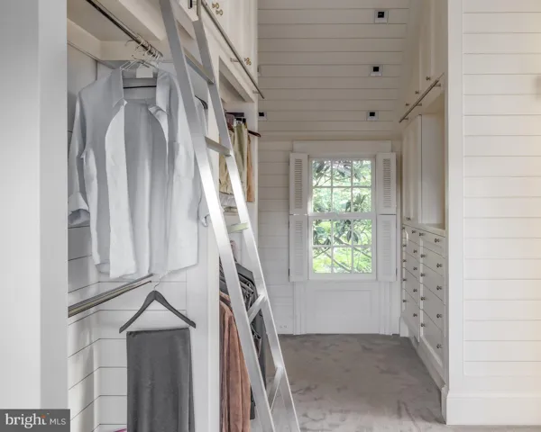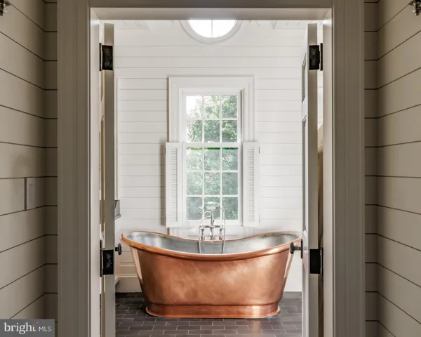 Upstairs, the primary suite occupies its own private wing; a sanctuary of serenity and scale. A vestibule opens to the main sleeping quarters beneath a vaulted shiplap ceiling. The adjoining dressing room impresses with its own vaulted ceiling, extensive built-ins, and rolling library ladder. The luxurious primary bath features dark floor tiles mirroring the dual vanities, which flank a handmade French soaking tub by Naudie. A skylit walk-in shower and separate water closet complete the suite. Three additional bedrooms each with stylish ensuite baths are also located on the upper level.