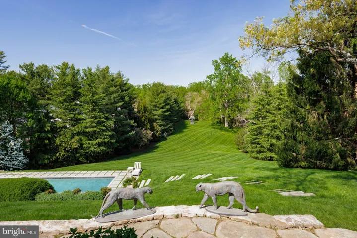 Outdoors, the estate’s whimsical grounds blend tiered gardens, mature trees, and extensive hardscaping into a tranquil, curated landscape. Landscape lighting and full irrigation ensure beauty day and night. A large lap pool with automatic cover and adjacent spa enjoy verdant views of the surrounding acreage.