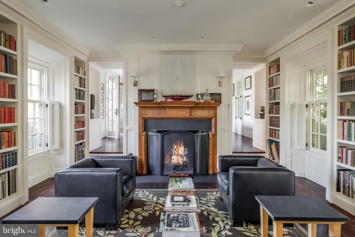 Inside, a central foyer bisects the main level, artfully dividing formal and informal living areas. The interiors are a masterful fusion of bold historic detail and stylish modernity, recently reimagined in collaboration with renowned designer Thomas Pheasant. Gleaming, dark-stained hardwood floors flow seamlessly throughout. The formal living room is generously scaled for elegant entertaining, opening through triple sets of doors to a flagstone patio. An exquisite fireplace with hand-carved wooden mantle anchors the far wall, while a step down reveals the dignified library, encased in built-ins and aglow with soft architectural lighting.