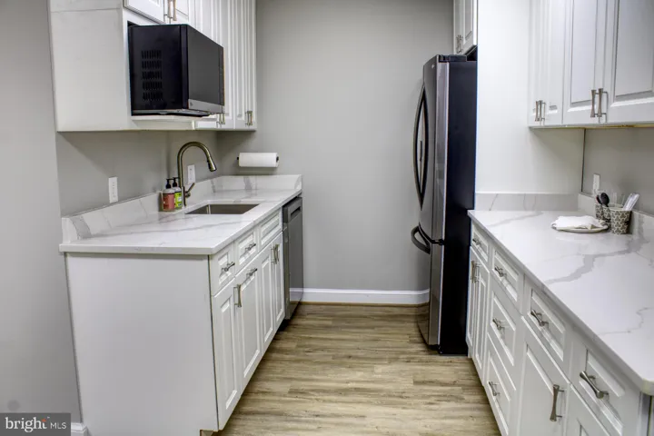 • Full kitchen with dishwasher, sink, fridge, microwave, and custom cabinetry