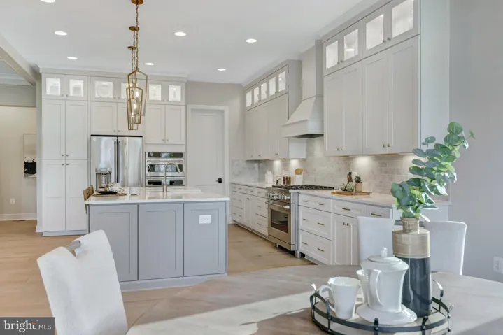 The Designer Kitchen is crafted to impress, showcasing elegant maple cabinetry extending to the 10-foot ceiling, complete with soft-close drawers and doors, and sleek quartz countertops. An expansive island provides generous seating and extra storage, creating the perfect setting for both casual gatherings and grand entertaining.