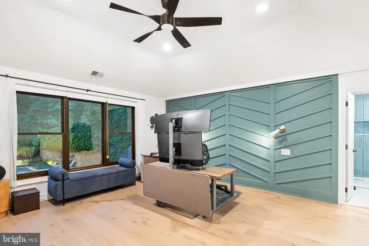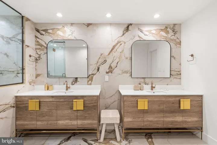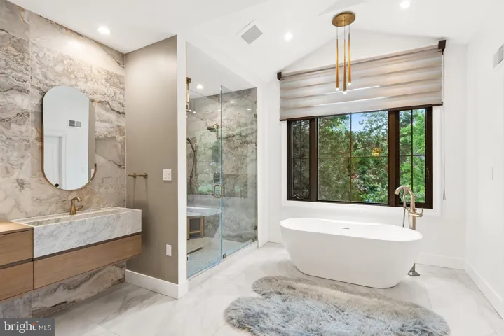 Just beyond, the main level primary suite is a sanctuary unto itself, featuring soaring ceilings, couture-inspired, dual dressing rooms with custom floor to ceilings built-ins and lighting, and an expansive, spa-quality bathroom with Porcelanosa vanities. Dramatic windows overlook the pool and gardens bringing the serene landscape indoors to this suite.