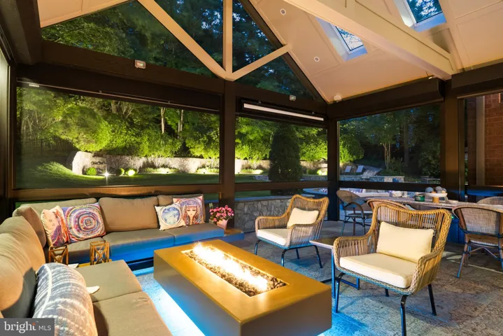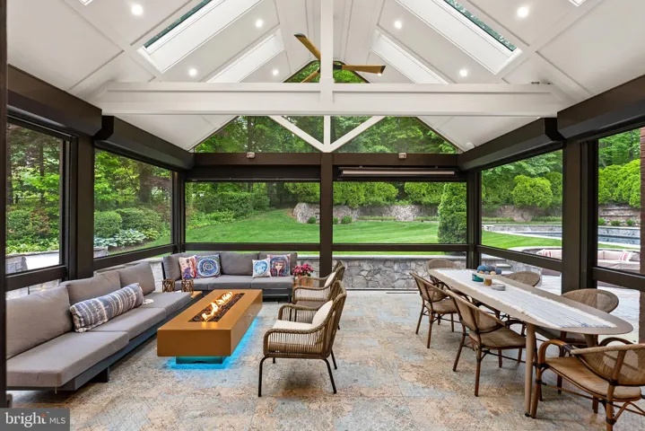 Nearby, the newly added screened-in porch with skylights, integrated firepit, and roll-down shutters creates a year-round retreat. The formal living room anchored by a second fireplace and the private library, enclosed with custom glass partitions, also overlook the resort-style pool for a tranquil yet inspiring work-from-home setting.