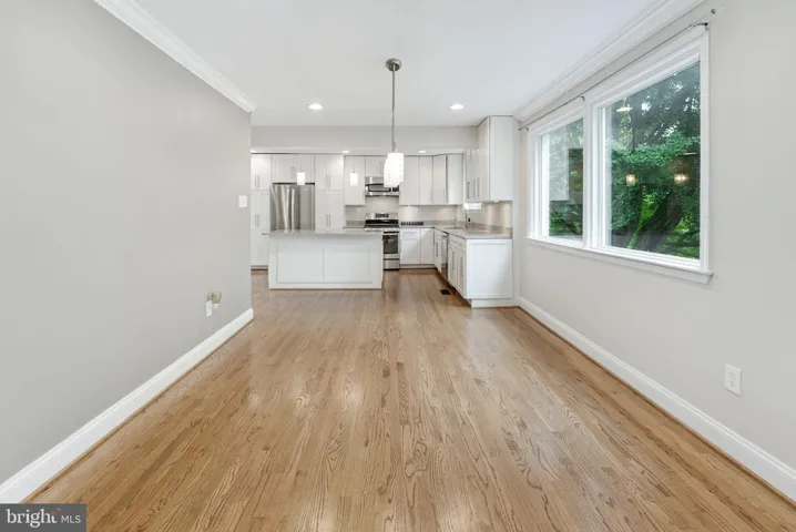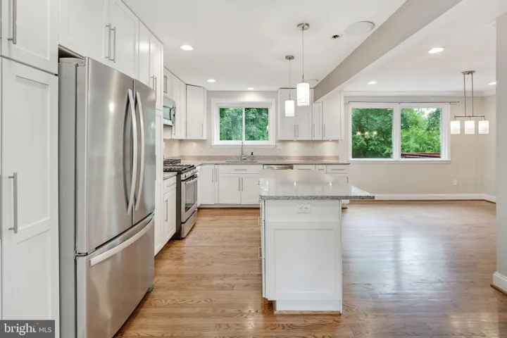 The renovated bright-white gourmet kitchen is equipped with high-end stainless steel appliances, Quartz countertops, and plenty of cabinet space, making it a dream for any home chef. The kitchen features a convenient breakfast island and opens to the dining room, both of which are flooded with natural light through large windows overlooking the spacious backyard.
