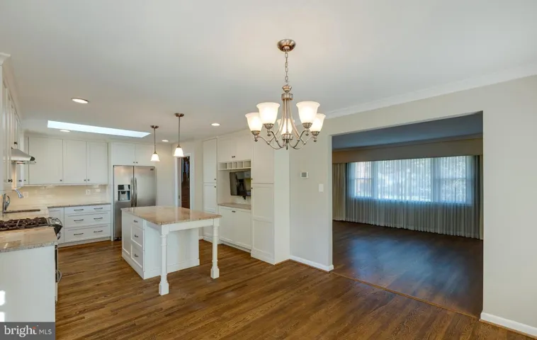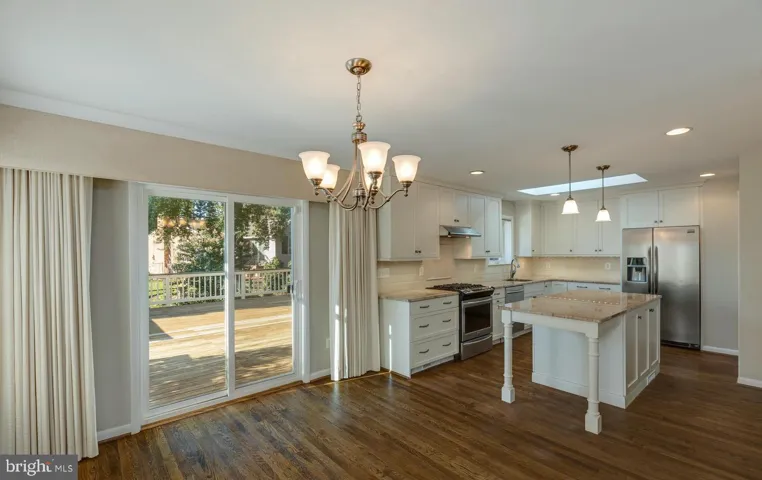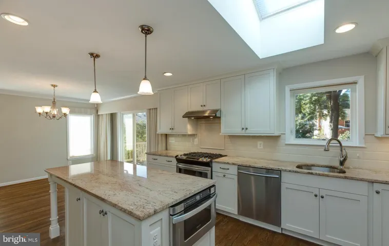 The kitchen features updated cabinetry, a skylight, granite countertops, stainless steel appliances, a large island with seating, and a cozy eat-in area—perfect for casual meals. The dining room opens to a lovely deck overlooking a fully fenced, private backyard—ideal for outdoor entertaining and relaxing.