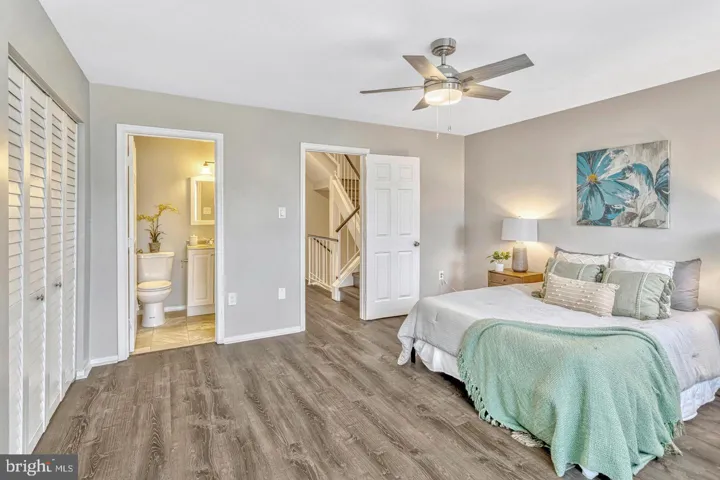 The spacious kitchen is a chef’s dream, equipped with stainless steel appliances, granite countertops, a breakfast bar, and a large pantry. Upstairs, the expansive primary bedroom offers multiple wide closets and a beautiful en suite bathroom with tasteful tile tub surround and modern fixtures. Nearby, the second bedroom boasts a ceiling fan and spacious closet, accompanied by a second full bathroom with handsome finishes.