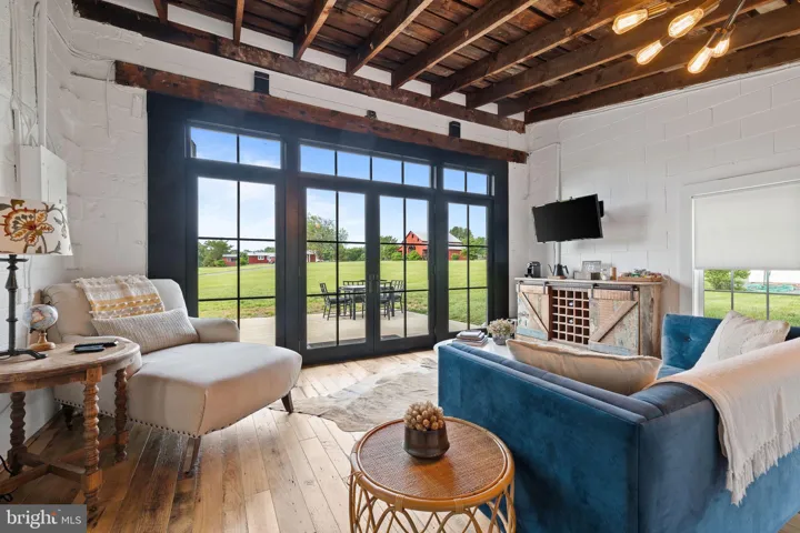 beautiful French doors that open on to a view of the two historic dairy barns and the corn